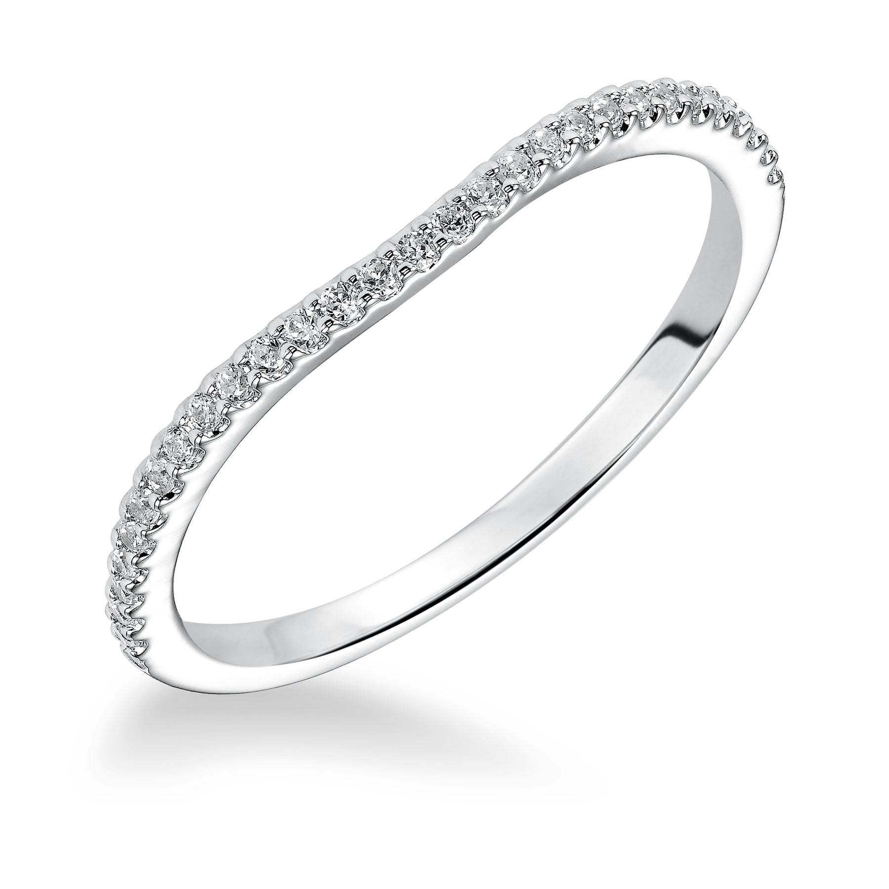 Wedding band with shared prong set, round diamonds and curved design to fit flush with matching engagement ring.