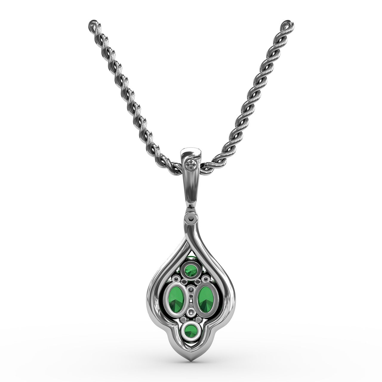 This precious emerald and diamond pendant comes in a variety of material types like 14k white gold, yellow gold, rose gold and can be customized. Fana gemstone pendants are perfect for that special woman in your life