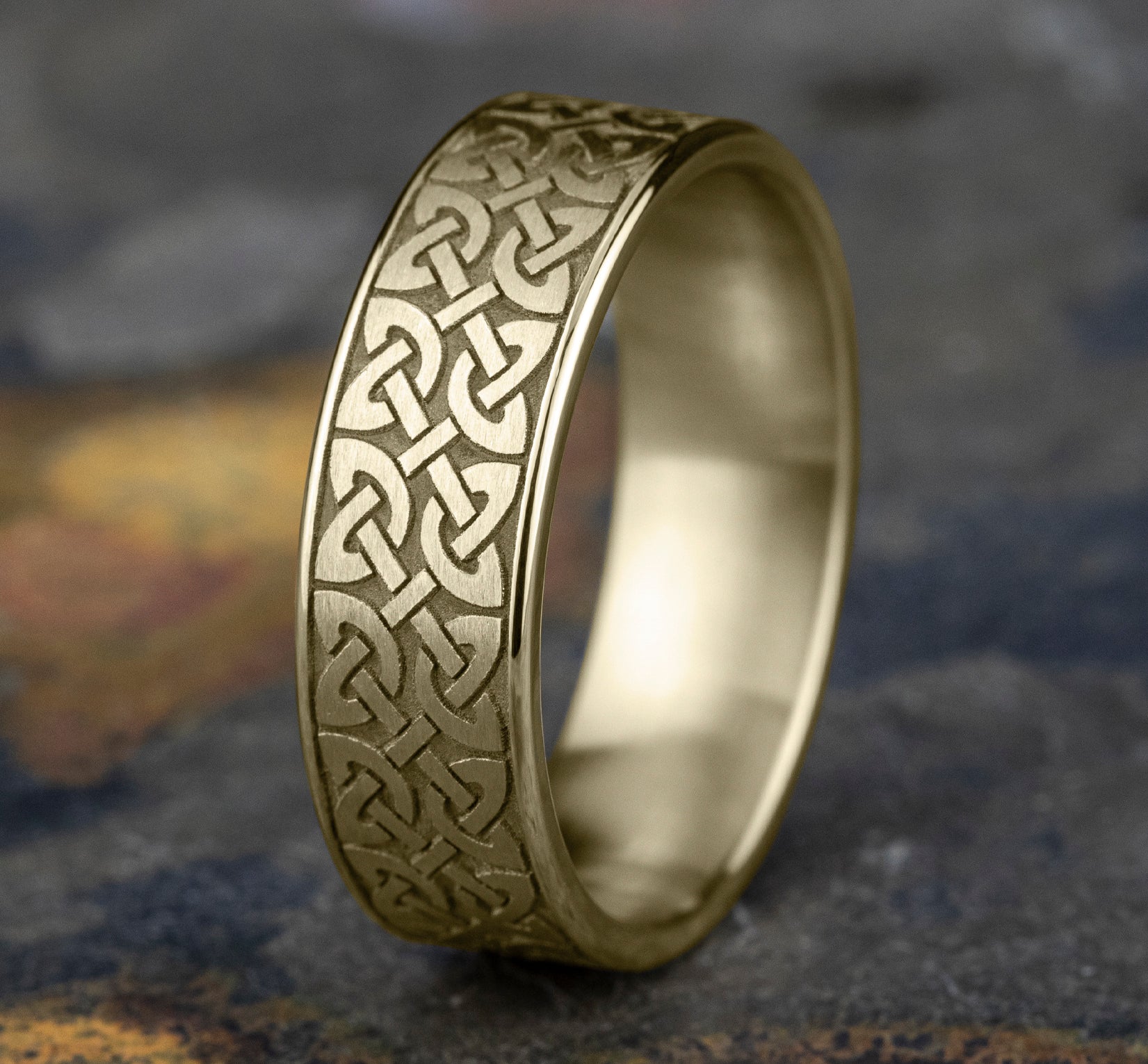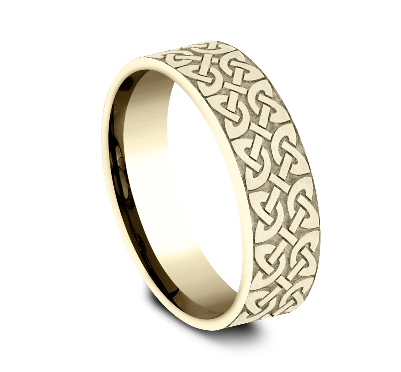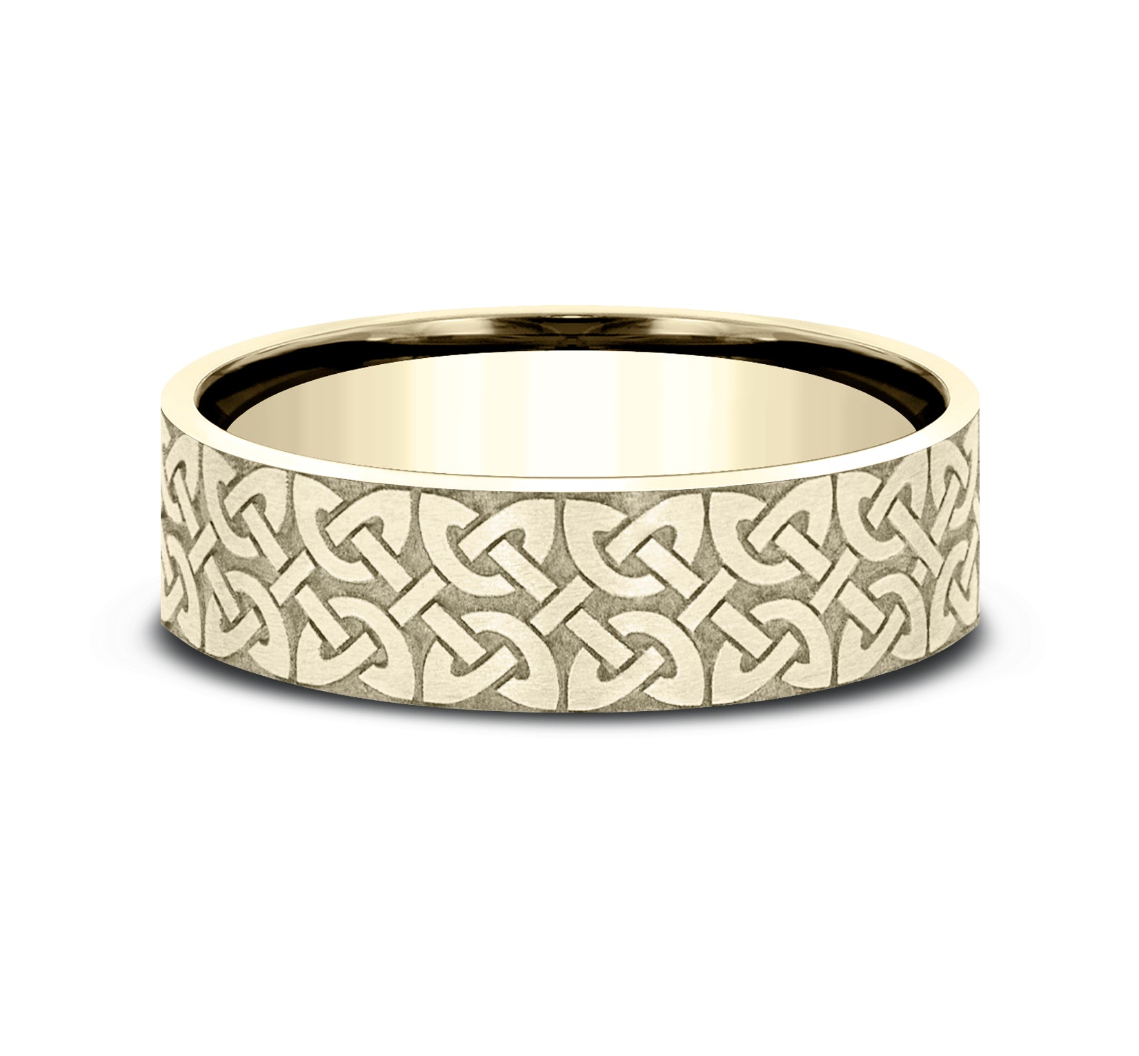 8mm, Comfort fit 14K White and Yellow Gold Celtic knot pattern, polished drop bevel edges