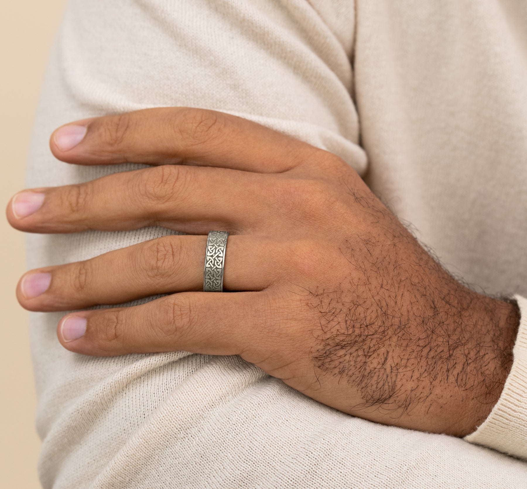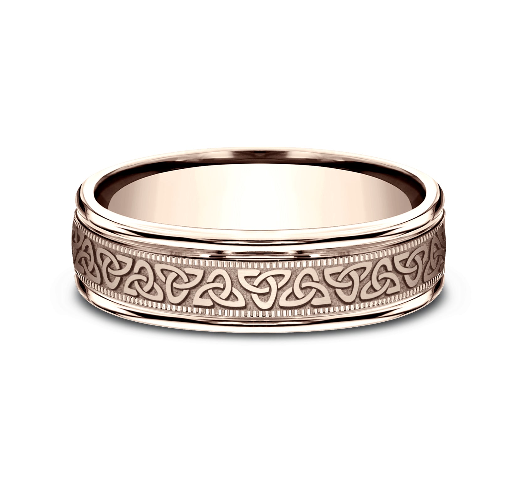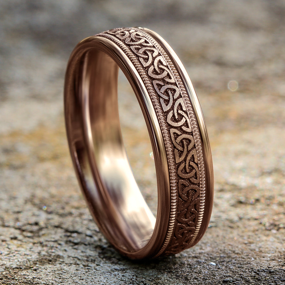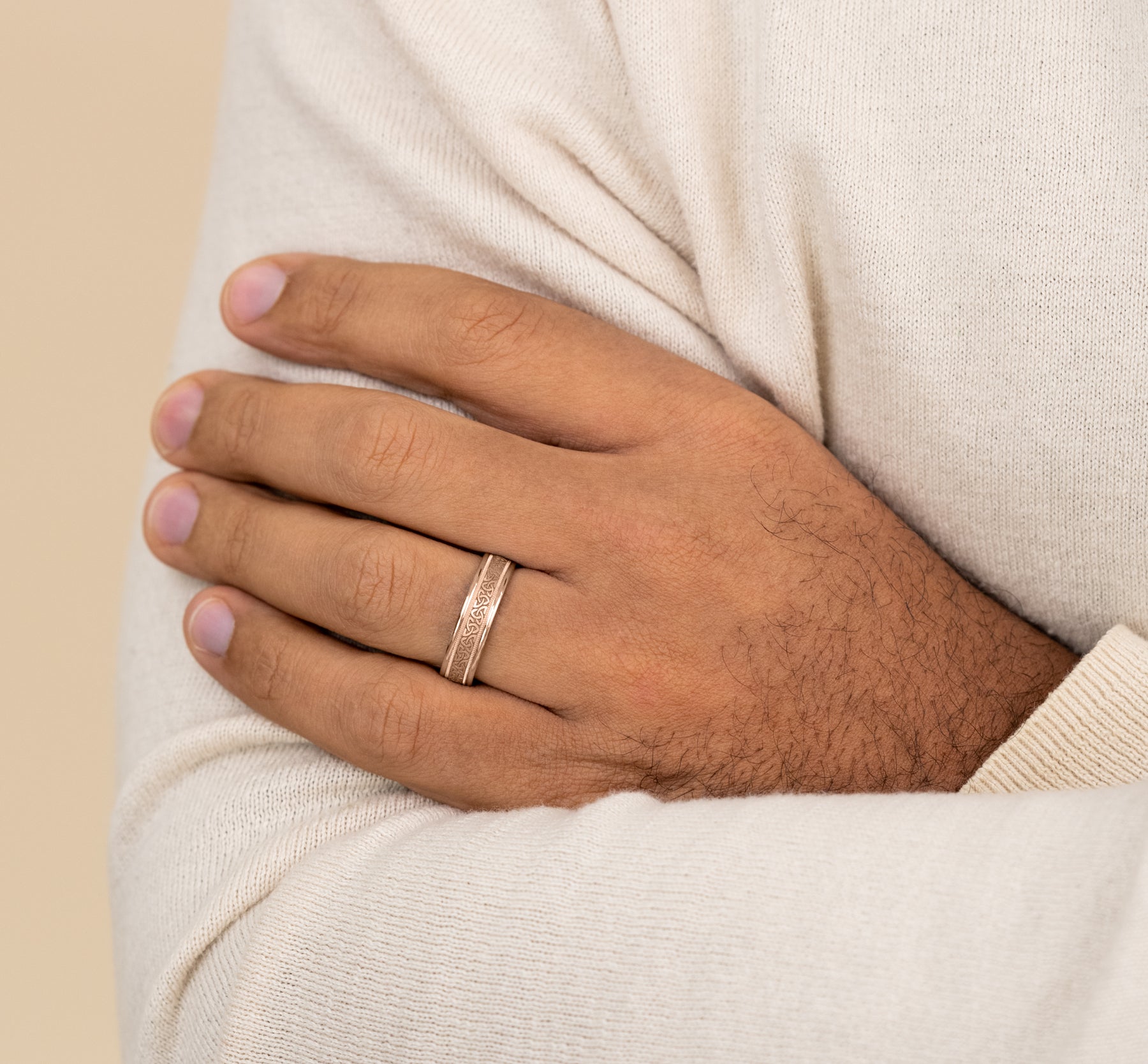 8mm, Comfort fit 14K White and Yellow Gold Celtic knot pattern, polished drop bevel edges
