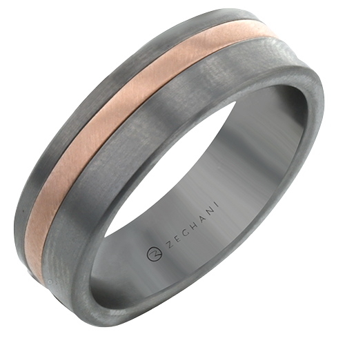 This bold 14k rose gold zirconium band is both refined and mysterious.